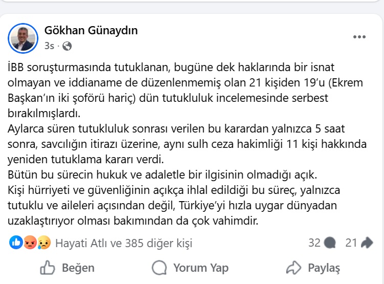 CHP Grup Başkanvekili Gökhan Günaydın, konuya ilişkin sosyal medya hesabından paylaşımda bulundu.